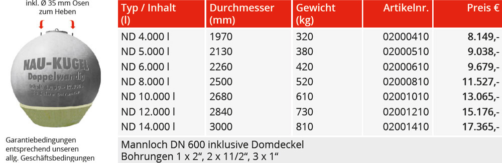 NAU Kugeltanks bestehen aus zwei ineinanderliegenden Öltanks. Die Tanks werden aus dem unzerstörbaren, glasfaserverstärkten Kunststoff GFK hergestellt, wodurch sie weder von innen noch von außen rosten. In einem von NAU patentierten Kreuzwickelverfahren werden die Tanks nahtlos und fugenlos gefertigt. Dadurch halten die Wandungen der inneren Kugeltanks einem Berstdruck von 13,5 bar stand. Verstärkungen aus Stahl oder Beton sind somit nicht notwendig.
